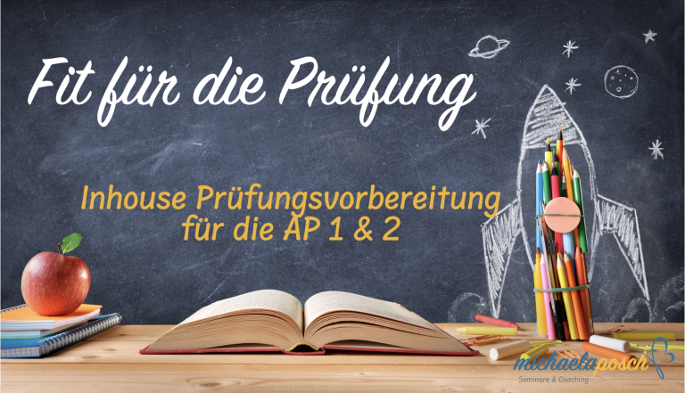 Fit für die Prüfung - eine inhouse Prüfungsvorbereitung digital oder in Präsenz. Mein Konzept basiert darauf, den Teilnehmenden möglichst simpel die Zusammenhänge prüfungsrelevanter Inhalte zu vermitteln. Mit selbstsicherem Gefühl zu persönlicher Bestleistung!